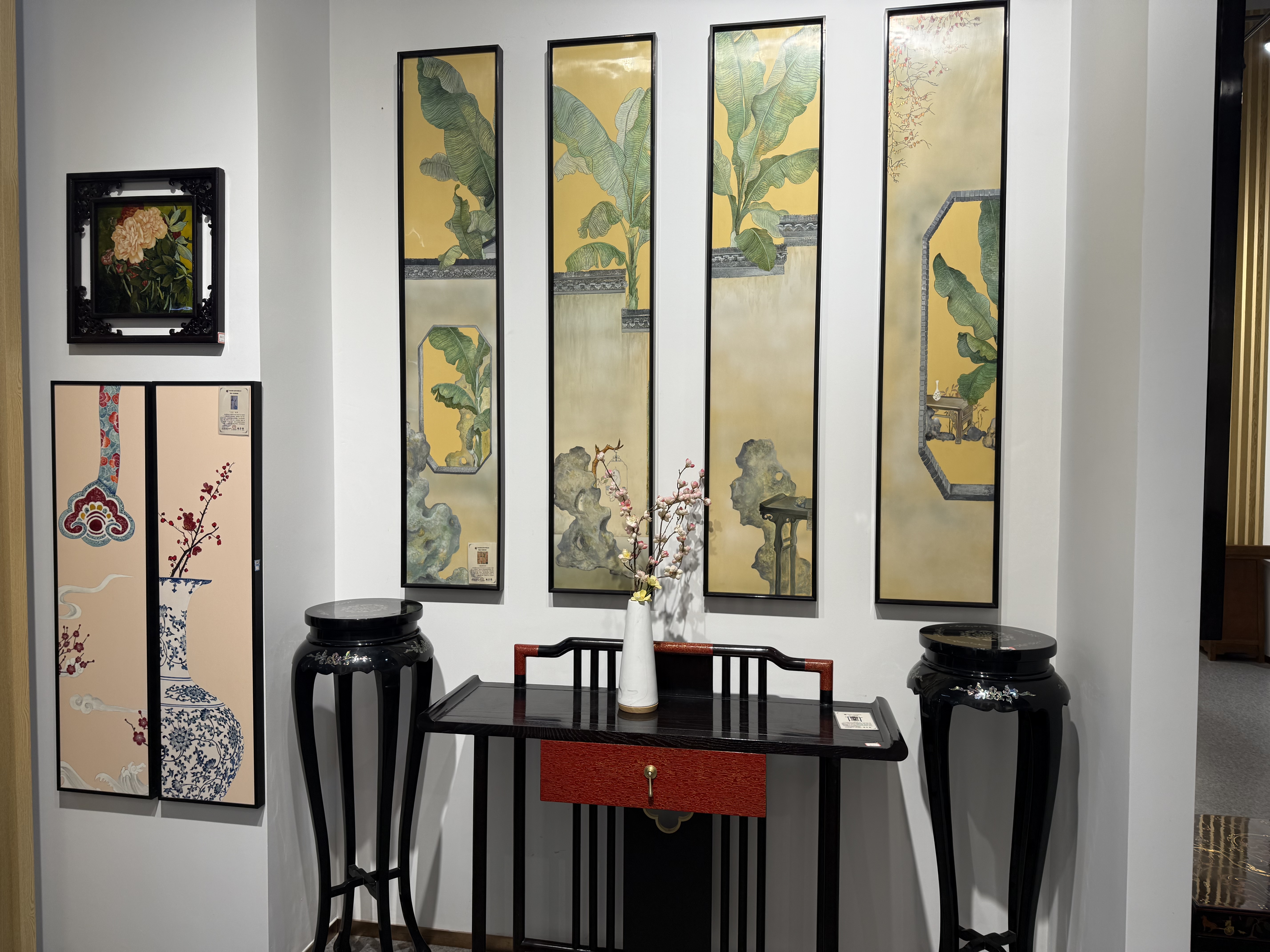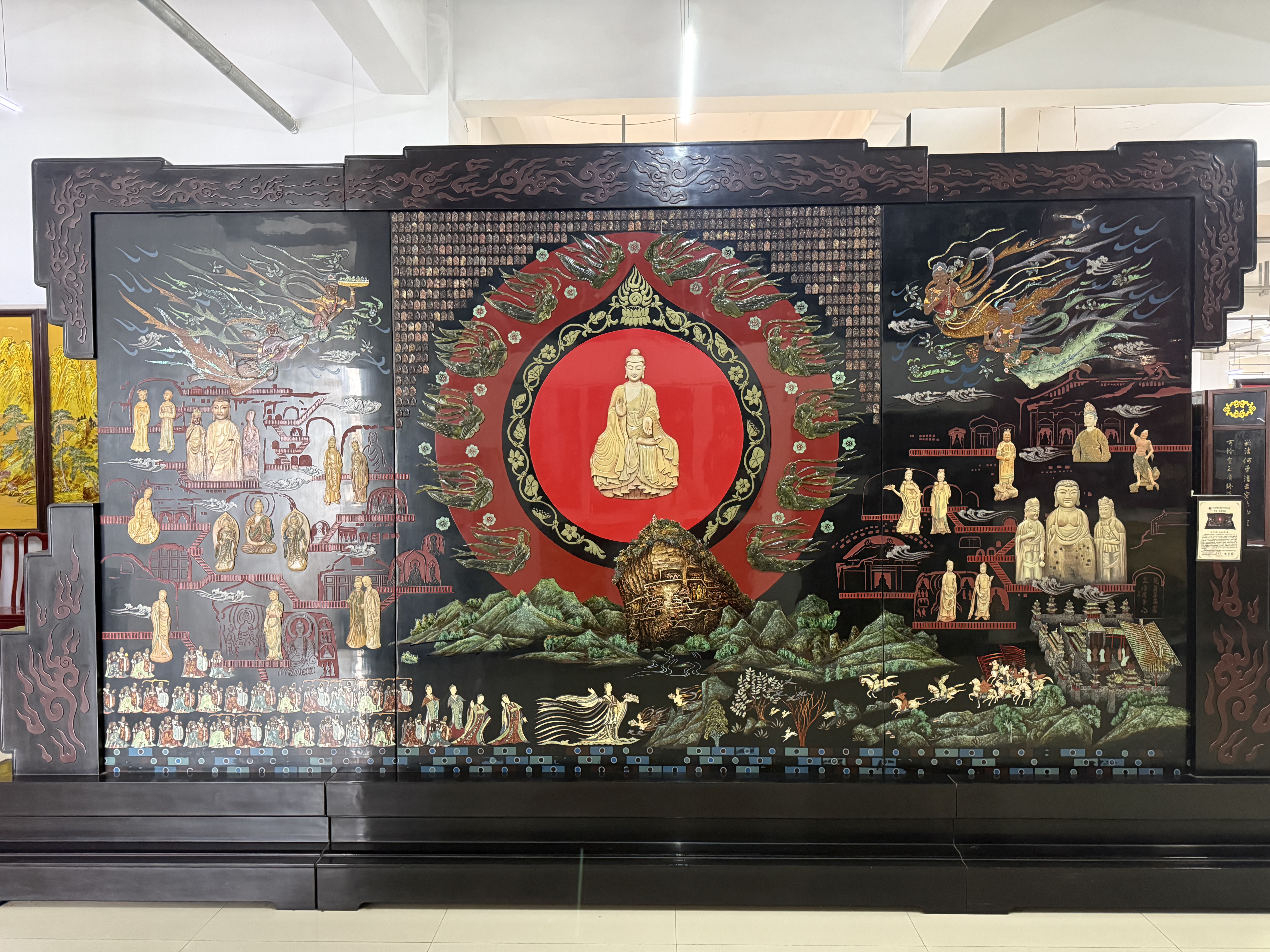 面對(duì)時(shí)代挑戰(zhàn),飛天雕漆以創(chuàng)新延續(xù)古老技藝的血脈。近三年攻克“起花磨顯工藝應(yīng)用”等10余項(xiàng)省市科研項(xiàng)目,成功研發(fā)彩色推光漆技術(shù),斬獲6項(xiàng)省級(jí)工藝美術(shù)大獎(jiǎng)。國(guó)家級(jí)傳承人張國(guó)棟領(lǐng)銜創(chuàng)作的巨幅漆藝《麥積瑰寶》,融合石刻、堆塑等技法,耗時(shí)一年再現(xiàn)麥積山石窟藝術(shù)精髓,成為當(dāng)代漆藝?yán)锍瘫?/p>