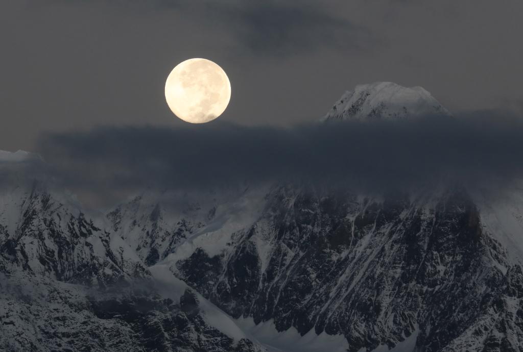 2024年10月17日,在云南迪慶藏族自治州梅里雪山拍攝的年度最大滿月。(白繼開 攝)