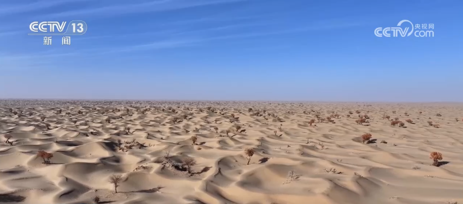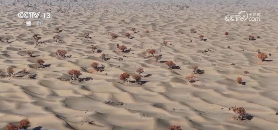 在新疆昆玉市以西的大片沙漠中,隨著天氣漸冷,胡楊的樹(shù)葉不再那么金黃耀眼,沙漠也多了一些蒼涼,更增添了幾分美感。胡楊樹(shù)虬曲的枝干挺立大漠,斑駁的樹(shù)影和樹(shù)下的落葉,如同一幅美不勝收的畫(huà)卷,暈染出層次分明的色彩。