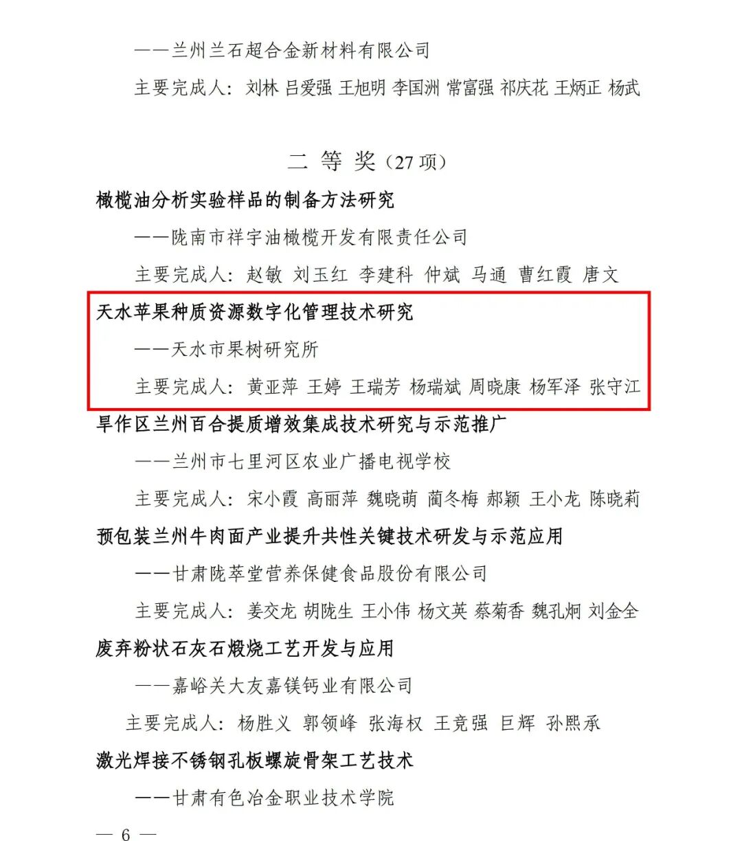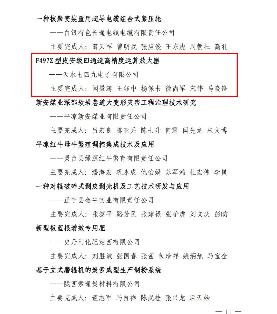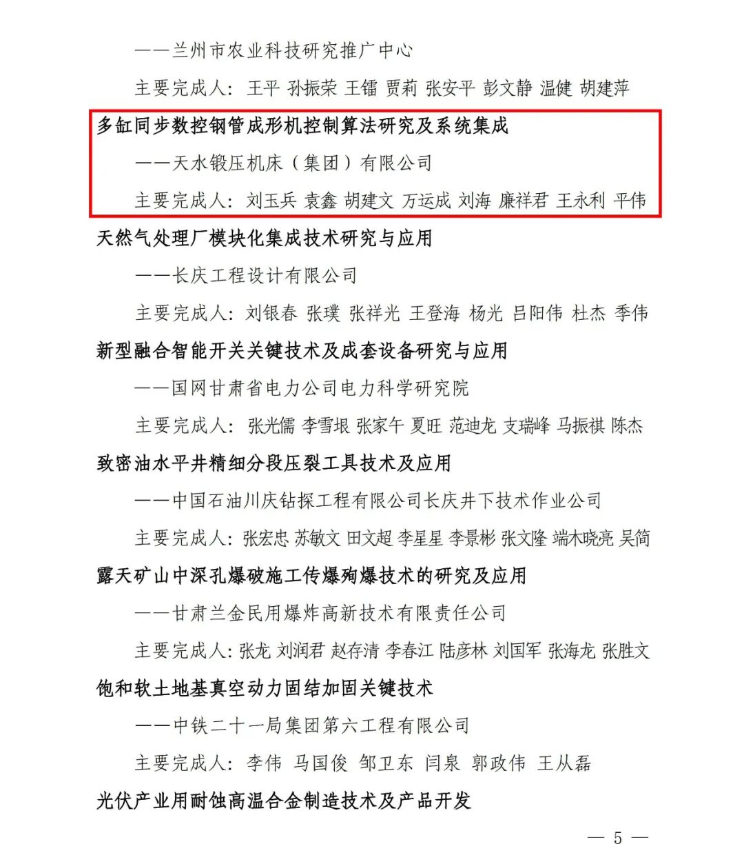 其中,天水鍛壓機床(集團)有限公司的《多缸同步數(shù)控鋼管成形機控制算法研究及系統(tǒng)集成》創(chuàng)新成果獲得一等獎;天水市果樹研究所的《天水蘋果種質(zhì)資源數(shù)字化管理技術(shù)研究》創(chuàng)新成果獲得二等獎;天水七四九電子有限公司的《F497Z型皮安級四通道高精度運算放大器》創(chuàng)新成果獲得三等獎。