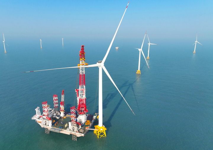 2026年1月13日在福建閩南海域拍攝的“大橋海風(fēng)”號(hào)2000噸自升式海上風(fēng)電安裝平臺(tái)和20兆瓦風(fēng)電機(jī)組吊裝現(xiàn)場(chǎng)(無(wú)人機(jī)照片)。新華社記者 林善傳 攝