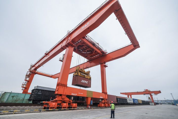 2026年1月30日,在義烏鐵路口岸,一列載著進(jìn)口商品的中歐班列回程班列在卸貨。新華社記者 徐昱 攝