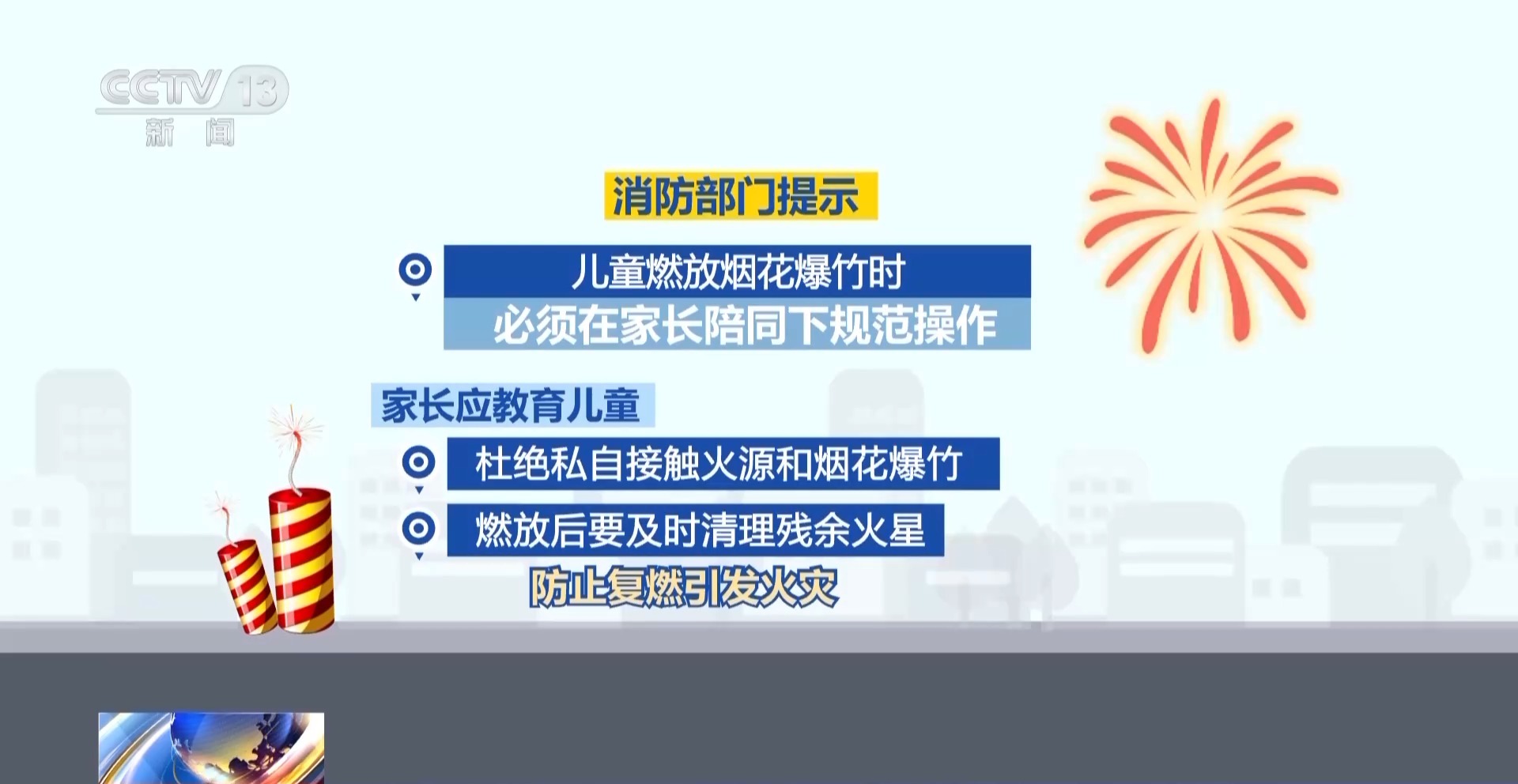 消防部門提示,兒童燃放煙花爆竹時,必須在家長陪同下規(guī)范操作。家長應教育兒童杜絕私自接觸火源和煙花爆竹,燃放后要及時清理殘余火星,防止復燃引發(fā)火災。