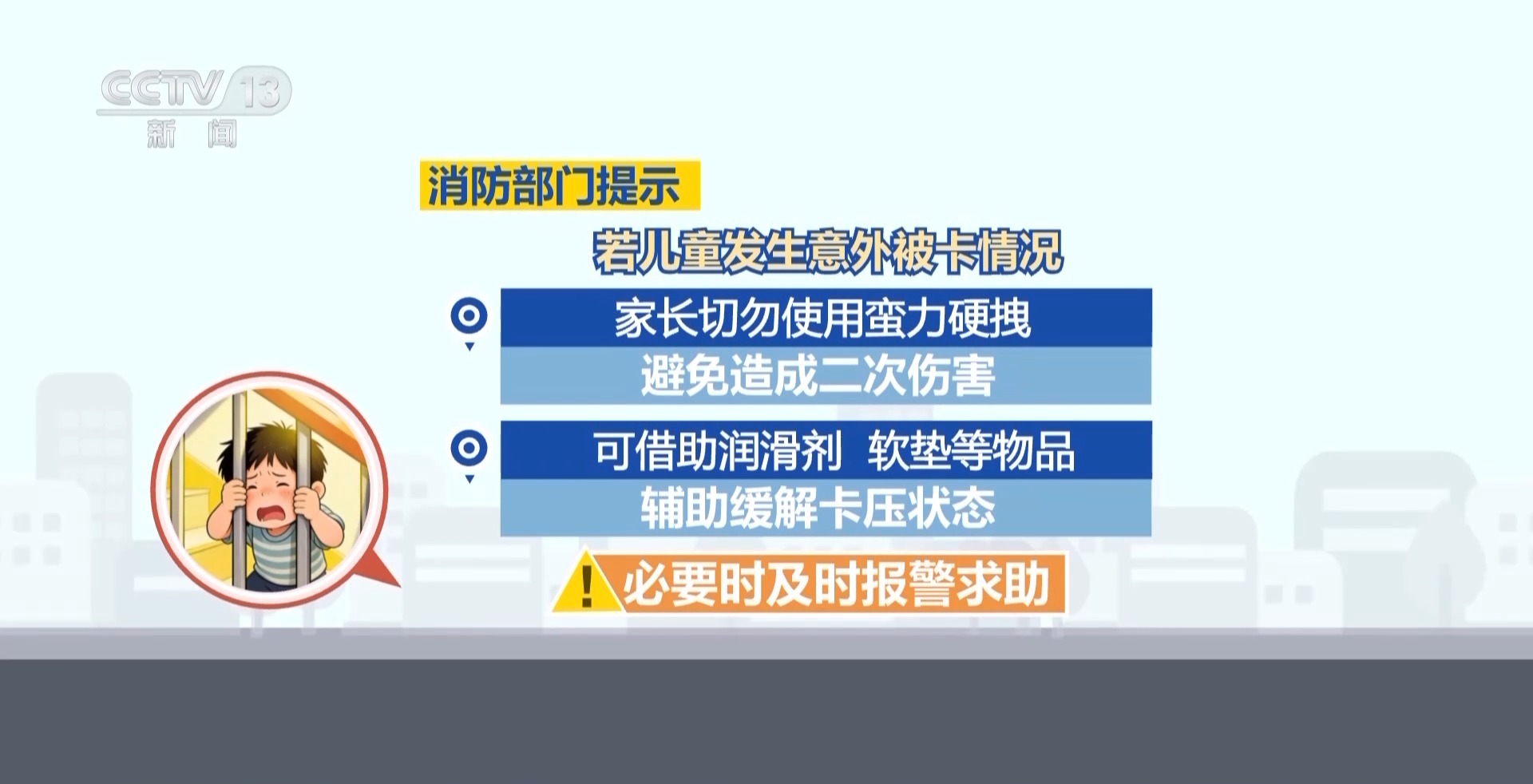 消防部門提示,若兒童發(fā)生意外被卡情況,家長切勿使用蠻力硬拽,避免造成二次傷害,可借助潤滑劑、軟墊等物品輔助緩解卡壓狀態(tài),必要時及時報警求助。