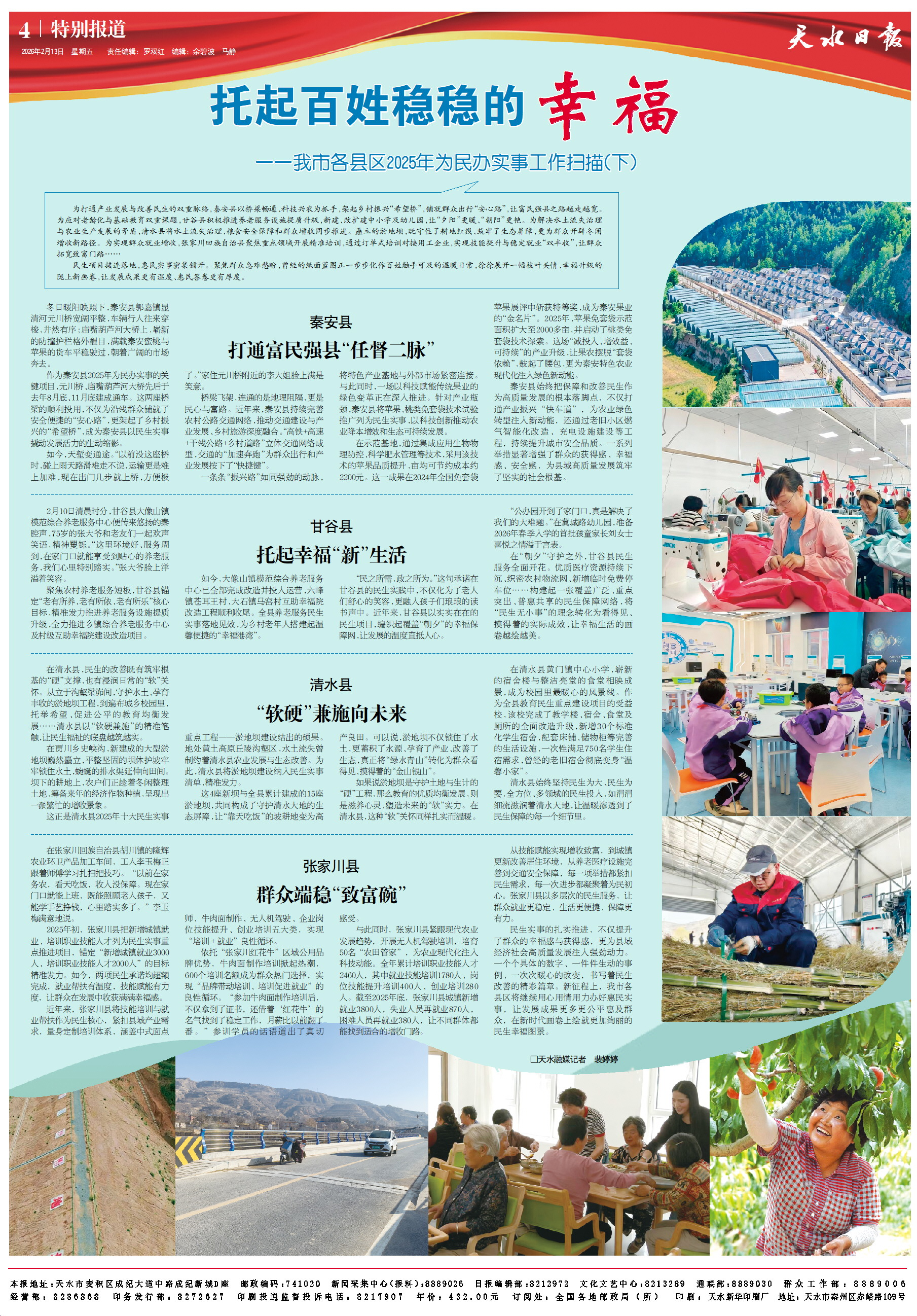 為打通產業(yè)發(fā)展與改善民生的雙重脈絡,秦安縣以橋梁暢通、科技興農為抓手,架起鄉(xiāng)村振興“希望橋”,鋪就群眾出行“安心路”,讓富民強縣之路越走越寬。為應對老齡化與基礎教育雙重課題,甘谷縣積極推進養(yǎng)老服務設施提質升級,新建、改擴建中小學及幼兒園,讓“夕陽”更暖、“朝陽”更艷。為解決水土流失治理與農業(yè)生產發(fā)展的矛盾,清水縣將水土流失治理、糧食安全保障和群眾增收同步推進。矗立的淤地壩,既守住了耕地紅線、筑牢了生態(tài)屏障,更為群眾開辟冬閑增收新路徑。為實現(xiàn)群眾就業(yè)增收,張家川回族自治縣聚焦重點領域開展精準培訓,通過訂單式培訓對接用工企業(yè),實現(xiàn)技能提升與穩(wěn)定就業(yè)“雙豐收”,讓群眾拓寬致富門路……