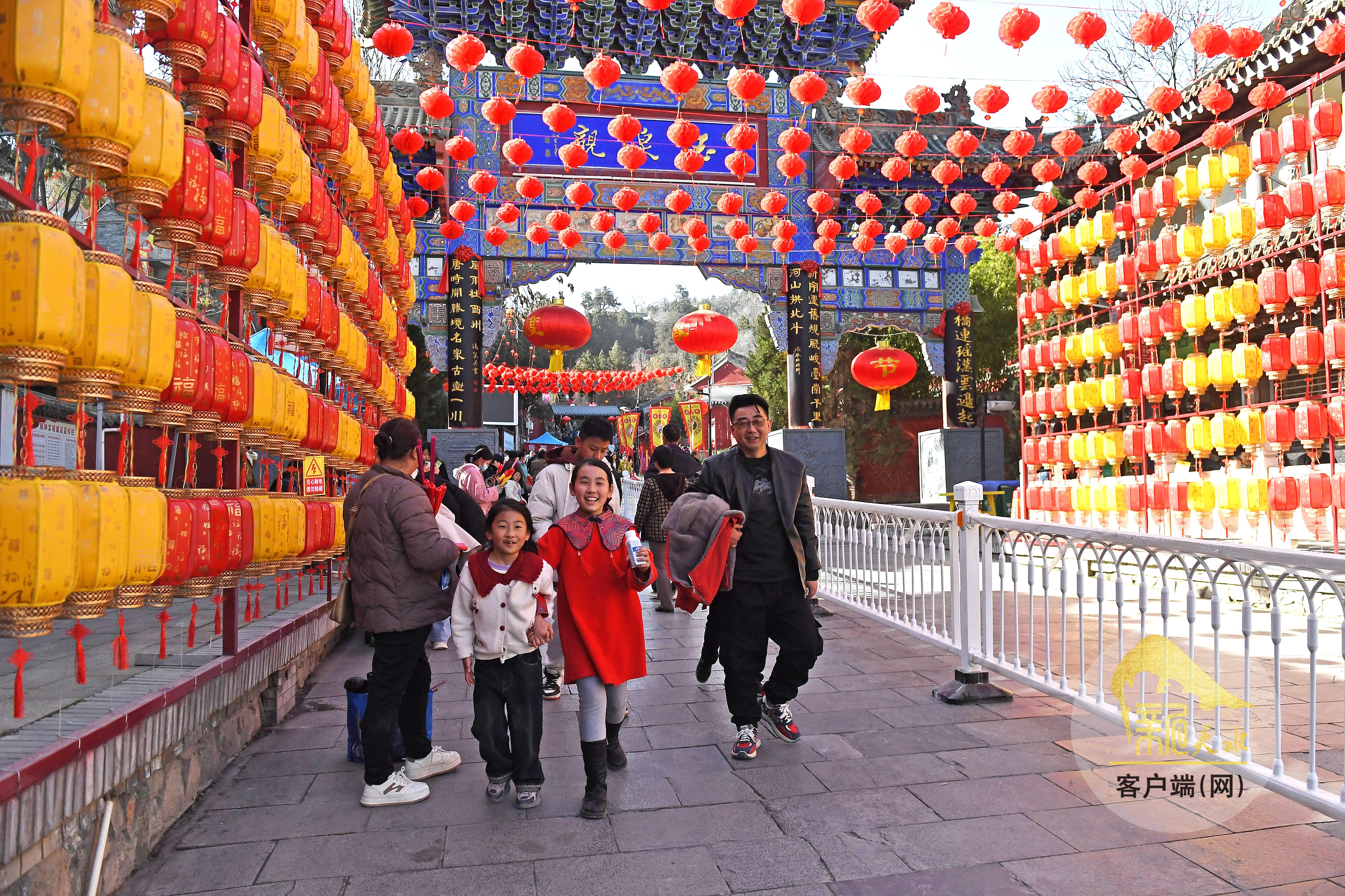 春節(jié)期間的玉泉景區(qū)燈籠高掛、彩旗招展。市民和游客紛紛參與民俗活動,沿著臺階游覽玉泉觀,系紅綢、摸香爐、猜燈謎,祈求福運吉祥。