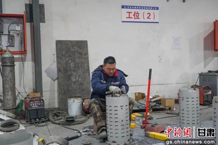 圖為秦安縣秦風(fēng)農(nóng)業(yè)機(jī)械有限公司的車間里,工人李松組裝“小金炮”智能防霜機(jī)。秦安縣融媒體中心供圖