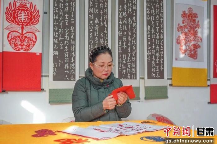 圖為秦安剪紙?zhí)焖屑?jí)傳承人安梅霞在剪紙。秦安縣融媒體中心供圖