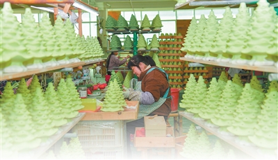 有一次看電視,正在報道國外的節(jié)日。節(jié)目里的圣誕樹,燈光很漂亮,這給了我啟發(fā)。于是我開始研究,怎么把燈珠和陶瓷結(jié)合起來,設(shè)計小巧精致、適合桌面擺放的陶瓷樹。2012年,我把樣品寄給國外客戶,他們價都沒講,當場下單。產(chǎn)品利潤比普通杯子、盤子等高出15%到20%,直到現(xiàn)在還供不應(yīng)求。今年,我們的訂單已排到8月份。