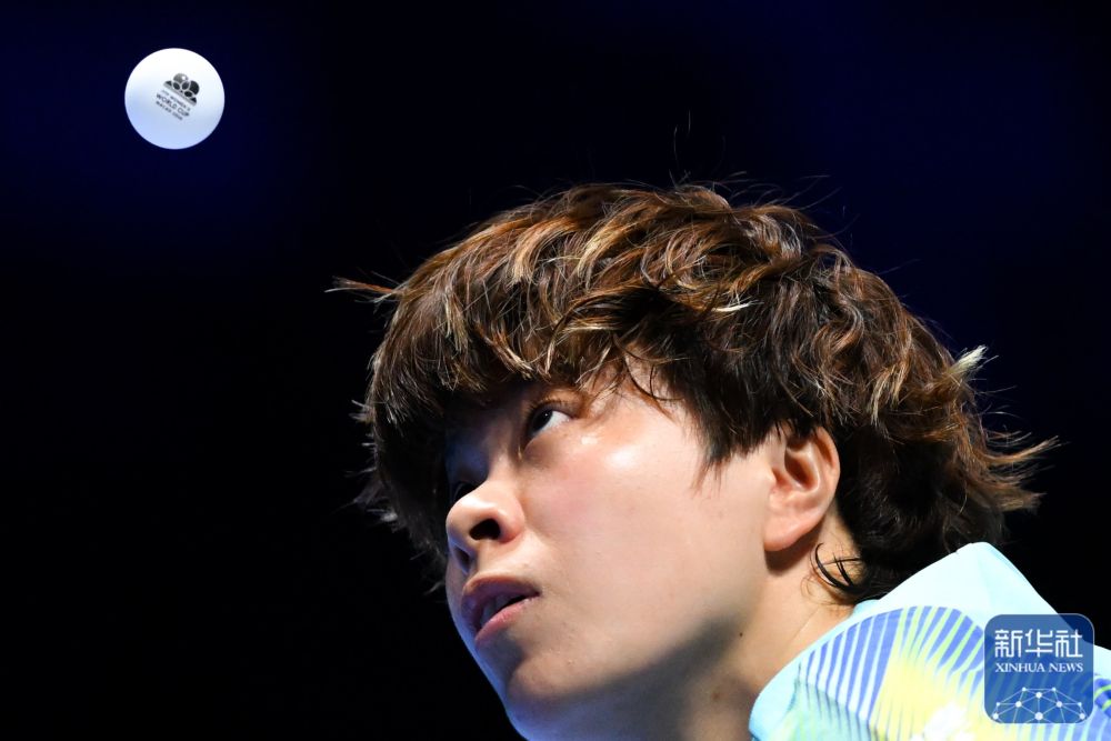 ↑日本選手伊藤美誠在女子單打小組賽中發(fā)球。最終,她3比2戰(zhàn)勝加拿大選手張默。