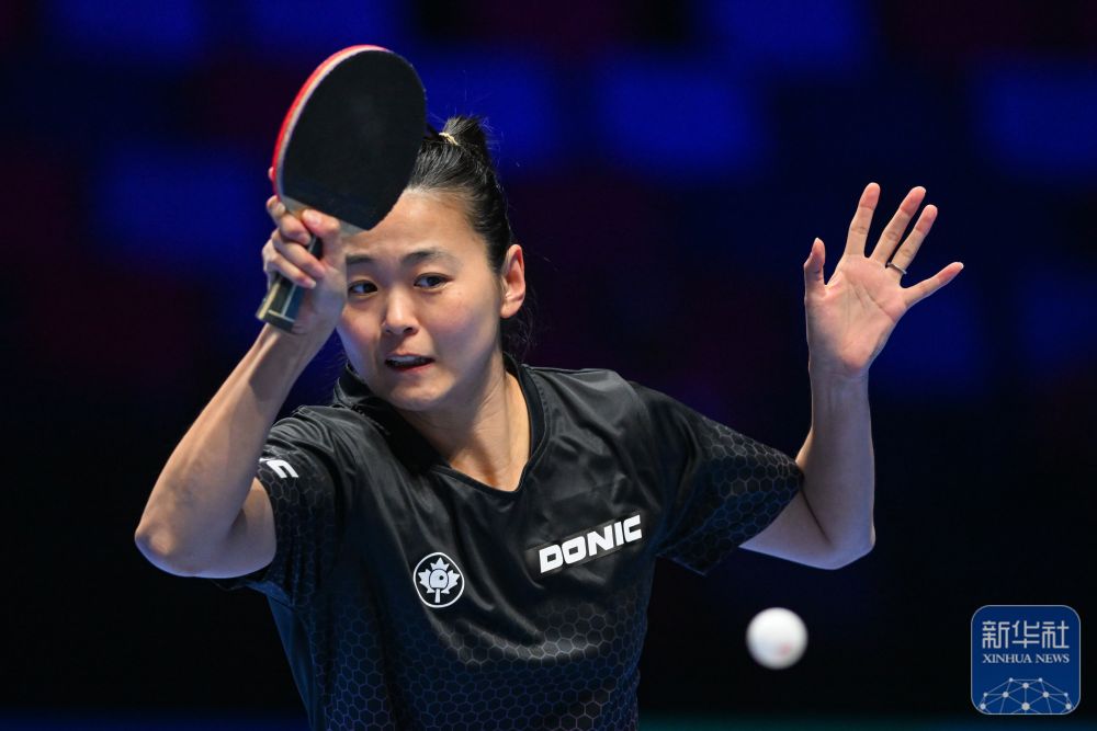 ↑加拿大選手張默在女子單打小組賽中回球。最終,她2比3不敵日本選手伊藤美誠。