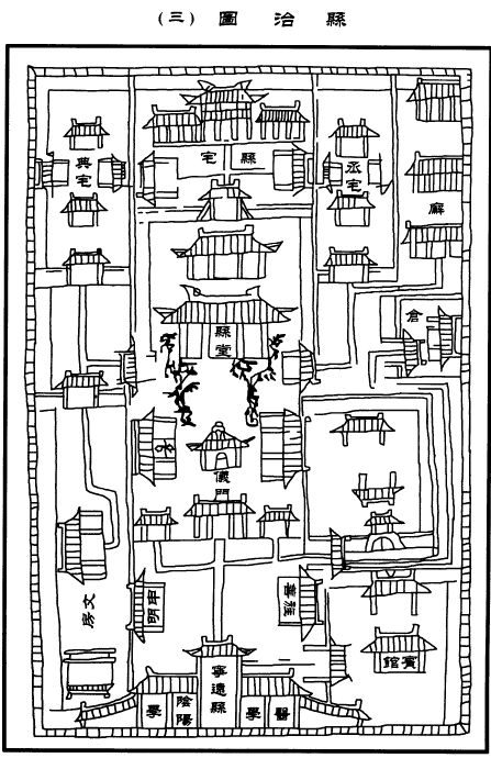 萬歷《寧遠(yuǎn)縣志》,鄒浩纂,明萬歷十五年(公元1587年)稿本。凡9卷32目。其卷一《圖象》附有縣境圖、縣城圖、縣治圖、廟學(xué)圖。其中“縣治圖”以實(shí)錄的方法,線刻縣衙及其他官署平面圖,單體建筑幾楹、街巷若何等都清清楚楚,甚至縣堂前的兩棵樹都標(biāo)出來了。此外,主要建筑還標(biāo)示名稱。以縣堂為中心,前為儀門,再前為旌善、申明二亭,再前為縣署大門和醫(yī)學(xué)、陰陽學(xué);后為縣宅??h堂東一路從后往前有丞宅、廨、倉、賓館,縣堂西一路從后往前有典宅、文房等。