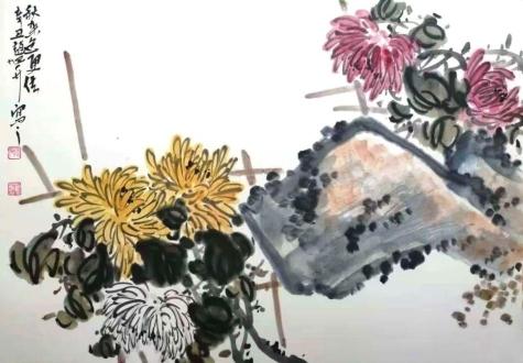 無論在寫生,還是創(chuàng)作過程中,趙旭升始終追求花鳥畫筆墨的干練、簡(jiǎn)約。經(jīng)過日積月累的自然觀察,以及對(duì)自然物象的不斷領(lǐng)悟,深深懂得花鳥草木的性情,并在作品中削其冗繁,得其神髓。我們?cè)谄洹队骸贰赌档?guó)色一品香》中能夠品讀到畫家深入生活、深入自然的創(chuàng)作理念,這些作品構(gòu)圖舒展穩(wěn)定,花瓣層層疊疊,具有“一朵妖紅翠欲流,春光回照雪霜羞”的感覺。畫家用細(xì)膩的藝術(shù)手法,將國(guó)色牡丹畫得格外豐潤(rùn),清香氤氳,一種恬淡的意韻躍然紙上,令人賞心悅目。其《晚香高節(jié)》中的菊花,具有“且看黃花晚節(jié)香”的寓意。挺拔的竹子,節(jié)節(jié)高,疏密有致的竹葉,順竹竿舒放。菊花、竹子依石而立,畫面雅致清爽,一股清剛之氣撲面而來,品之沁人心脾,同時(shí)也寫出畫家胸臆。趙旭升的《秋來色更佳》《可酤酒》《東籬秋色》,把菊花堅(jiān)強(qiáng)不屈、氣韻超逸、孤傲脫俗的精神品質(zhì),用藝術(shù)的手法再現(xiàn)給受眾,耐人尋味。