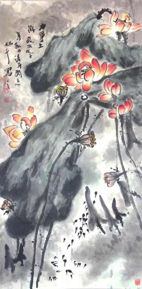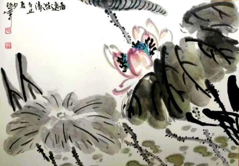 在花鳥畫作品創(chuàng)作中,荷花是畫家最具青睞的題材,因其“出淤泥而不染,濯清漣而不妖”的品格,贏得了“君子”花的美稱,為世人所喜愛。趙旭升創(chuàng)作的《力爭(zhēng)上游》,細(xì)細(xì)品味,雖水墨效果不太明顯,但其構(gòu)圖奇巧,把荷花磊落不羈、堅(jiān)韌孤傲的特點(diǎn)表現(xiàn)得淋漓盡致,充滿自然天成。生機(jī)盎然的《香遠(yuǎn)益清》呈現(xiàn)得清純而高潔,舒展的荷葉自然超逸,生命的底色顯露得更加絢麗奪目。