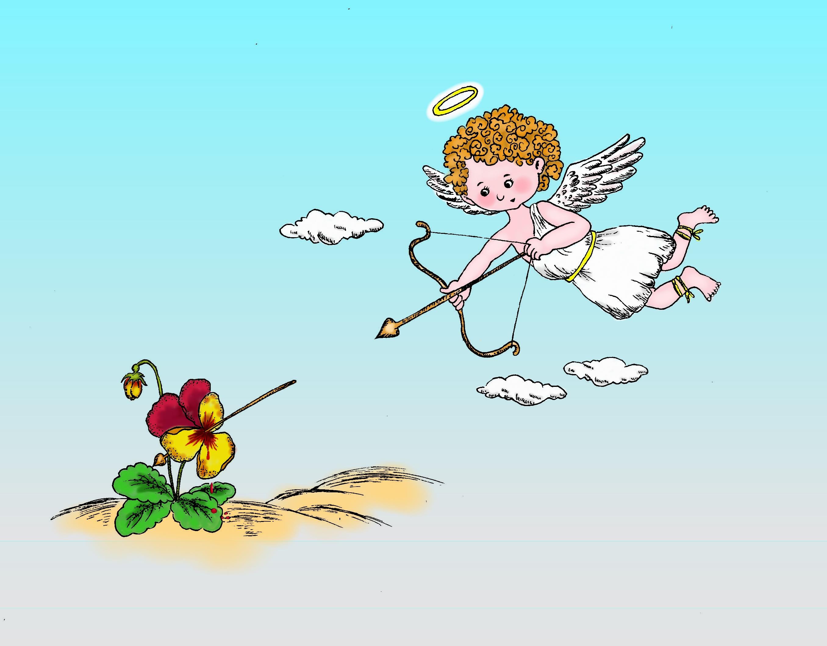 來看看國外的傳說。很久以前,三色堇是純白色,就像蔚藍(lán)天空的云一般潔白。頑皮的愛神丘比特,常常用他手中擁有愛情魔力的弓箭射擊,箭頭射中誰,誰就會情不自禁愛上中箭后他第一眼看見的人??上?,頑皮的愛神箭法欠佳,所以,人間的愛情常常出錯。這天,愛神又找到一個目標(biāo),準(zhǔn)備拿他當(dāng)靶子來練,誰知箭射出后,忽然刮起一陣風(fēng),這支箭便不偏不倚地射中了一朵三色堇花。霎時,從三色堇的花心位置,流出了鮮血和淚水。白色花朵上的血淚,干了之后,就再也抹不去了。從此,三色堇變成了白、紫、黃經(jīng)典的三色圖案。