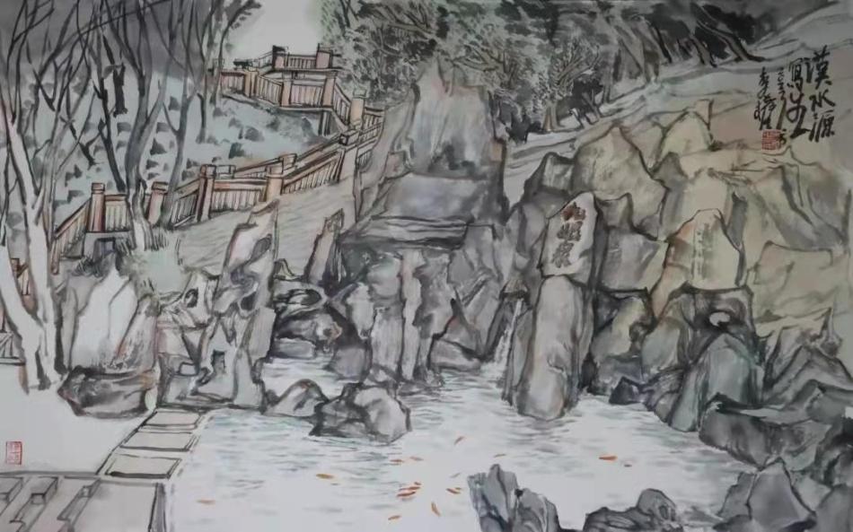 李權(quán)是個(gè)全面的畫家,在業(yè)界已經(jīng)很有影響了。這次展出的山水,多為寫生作品,傳統(tǒng)根基扎實(shí),款字也入味。他畫村景,林壑大野、溪泉飛瀑大多來自行走與漫游的記錄。因?yàn)閷懮?,那些鮮活的細(xì)節(jié),清靜淡遠(yuǎn),讓人贊嘆。因?yàn)樽非笤煨偷木珳?zhǔn),清正雅宜的同時(shí)又略顯中規(guī)中矩,他是嚴(yán)謹(jǐn)?shù)模漠嬕踩缢臑槿撕V實(shí)穩(wěn)練,去除了文人畫家不計(jì)工拙揮灑成幅的流俗,少有那種怪力亂神的江湖氣。也許這就是正大氣象,可以肯定,他在路上還在不斷探索、尋找、融化,相信他的搏擊會(huì)到無人敢問津的藝術(shù)深水中去。