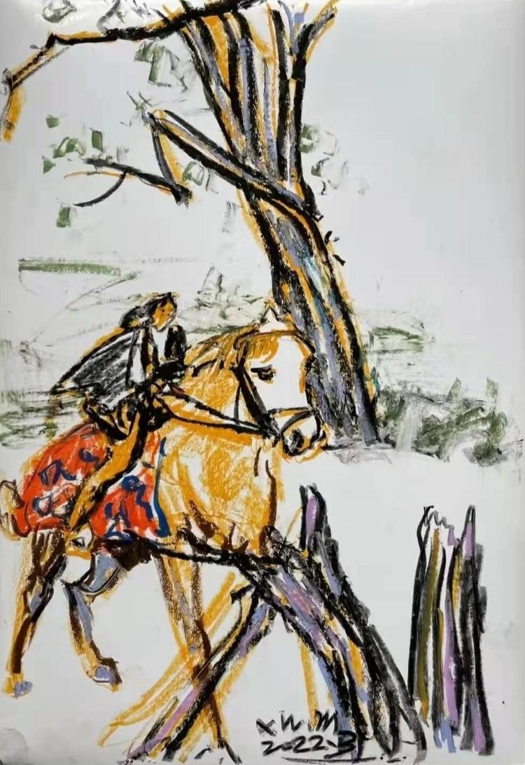 四人中,除了孟小為,其他三位都是西和畫家,小為是老朋友了,他寫詩、教學(xué)、拍紀(jì)錄片樣樣風(fēng)生水起,享有大名。無論干什么行當(dāng)他根性上是一位詩人,無論水墨、油彩,人物也好,風(fēng)景、禽獸也罷,都是他的藝術(shù)意象。他從梵高、高更、夏加爾、八大山人那里擷取的光影、色調(diào)和造型,都為他的藝術(shù)旨趣所用,不囿于既成的范式。雖然多描摹異域風(fēng)光片段或生命形態(tài),皆是如歌的散板,畫家才情躍然紙上,細(xì)細(xì)賞讀似乎亦有我們心中所有又無以言語的哀傷、焦灼、無奈與迷惘……也許這是畫家生命情感經(jīng)歷的外化,也許這是畫家心域糾結(jié)的圖景。他的色彩明麗炫目,線質(zhì)縱逸恣肆,大有“獨(dú)持偏見,一意孤行”之意。他畫的少女自由舒展,洋溢著來自青春的曼妙,伴隨著音樂與歌唱、愛與溫暖。他就像一個(gè)喝酒吃肉的狂僧,拓落不羈又回到本心。