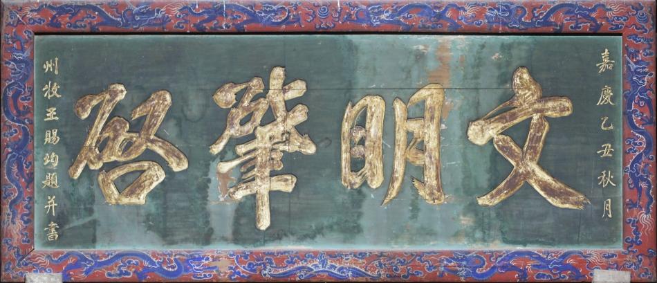 天水伏羲廟先天殿暖閣上方,有一塊清代匾額,上書“文明肇啟”四字。匾文綠底金字,上款為“嘉慶乙丑秋月”,下款為“州牧王賜均題并書”。四邊框彩繪龍紋圖案,紅底藍(lán)彩;上部中間為雙龍戲珠紋,左右雙龍相對(duì);下部中間為海水仙山紋,左右雙龍相對(duì);兩側(cè)邊為單翔龍,龍紋及周邊間飾云朵,四角為火珠紋、折枝花卉紋。