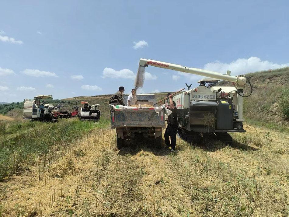 在秦嶺鎮(zhèn)梨樹(shù)村的千畝油菜種植示范基地,三臺(tái)聯(lián)合收割機(jī)在油菜田里來(lái)回穿梭,一排排成熟的油菜稈被卷入收割機(jī),圓潤(rùn)飽滿、烏黑發(fā)亮的油菜籽,從收割機(jī)的出料口噴薄而出,空氣里都是豐收的喜悅。