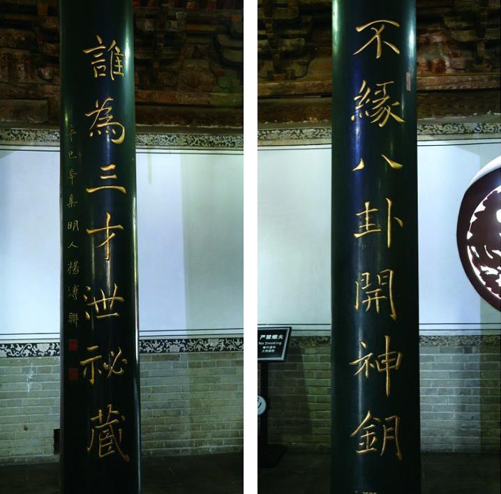 下聯(lián)“誰(shuí)為三才泄秘藏”中,三才:即《易》所講的天、地、人。《說(shuō)卦傳》云:“昔者圣人之作《易》也,將以順性命之理。是以立天之道,曰陰與陽(yáng);立地之道,曰柔與剛;立人之道,曰仁與義。兼三才而兩之,故《易》六畫而成卦;分陰分陽(yáng),迭用柔剛,故《易》六位而成章。”這段話譯成現(xiàn)代漢語(yǔ)就是:從前圣人之所以作《易經(jīng)》,就是要用它來(lái)理順性與命的道理。所以,用陰與陽(yáng)來(lái)闡明天道,用柔與剛來(lái)闡明地道,用仁與義來(lái)闡明人道,兼顧了天、地、人三才又各分為二,因而《易經(jīng)》六個(gè)爻就成為一卦;分陰分陽(yáng),交替運(yùn)用柔剛就成了一章?!断缔o傳》云:“六爻之動(dòng),三極之道也?!贝司渥g成現(xiàn)代漢語(yǔ)就是:六爻的變動(dòng),揭示了天道、地道和人道的變化規(guī)律。泄:泄露。秘藏:此指六爻的變動(dòng)能夠讓人們推知往事,預(yù)測(cè)未來(lái)之事?!断缔o傳》云:“圣人以此洗心,退藏于密,吉兇與民同患。神以知來(lái),知以藏往,其孰能與于此哉!”這段話譯成現(xiàn)代漢語(yǔ)就是:圣人用八卦囊括的法則來(lái)凈化心靈,退隱于僻靜之處,與民眾共擔(dān)吉兇。然其神可以預(yù)知未來(lái),智可以涵蓋往事,除了圣人,誰(shuí)又能做到這些呢!
