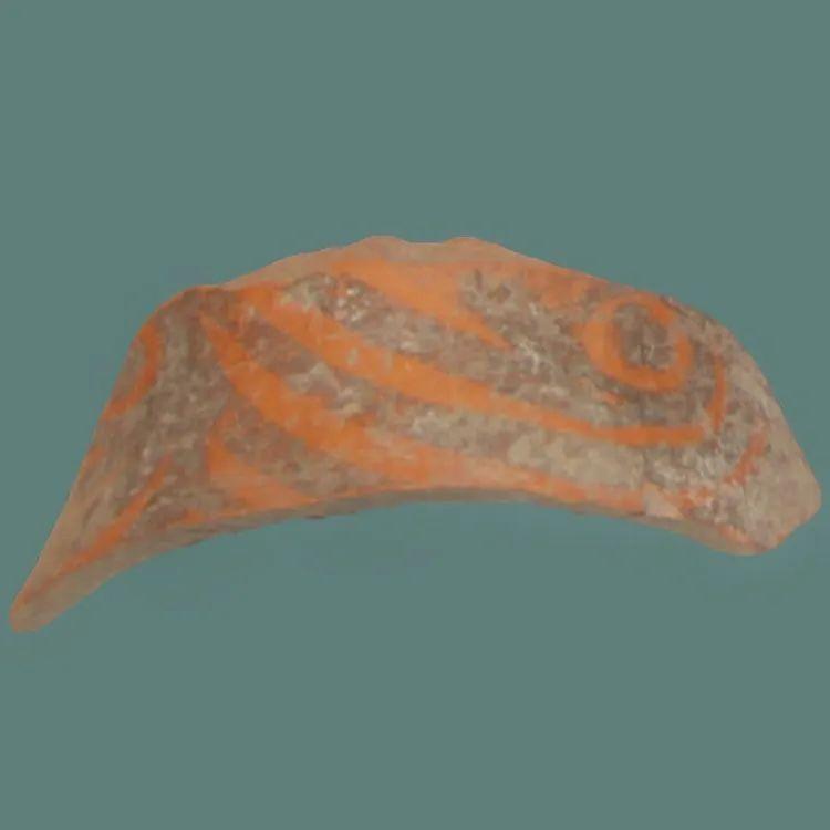 張家臺(tái)子遺址出土石嶺下文化彩陶片。細(xì)泥質(zhì)橙黃陶,略呈弧狀長(zhǎng)方片,表面光滑,以黑彩繪弧線、弧線三角和圓圈帶點(diǎn)紋,構(gòu)成一變體鳥頭紋圖案。