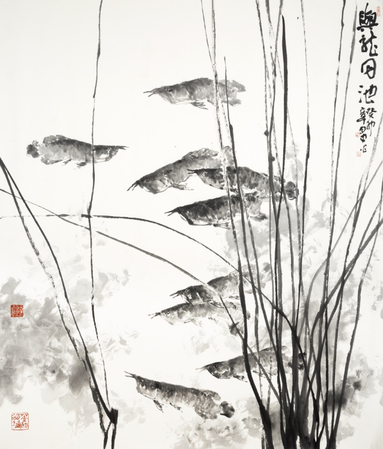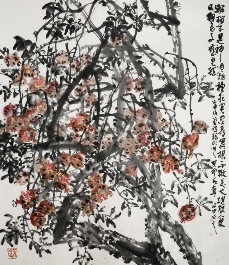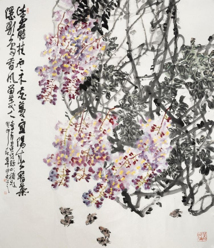 實際上,大寫意花鳥畫是寫生記憶中的花鳥,是對生命感受到的花鳥的深情。如果說境界是寫意花鳥畫的靈魂,筆墨是性情的體現(xiàn),那么寓興的功能就體現(xiàn)在“有以興起人之意者,率能奪造化而移精神”。來源于生活而高于生活,來自于客體而奪造化移精神。惲壽平在評畫時曾說:“其意象在六合之表,榮落在四時之外?!边@句話道出了花鳥畫穿越時空追求精神境界的真諦。章月中的寫意花鳥畫重氣局、重境界、重精神,有文化傳統(tǒng)之血脈,有當(dāng)代生活之底蘊(yùn),有洋為中用之取舍,托物言志,寓情于理,具有鼓舞人民朝氣蓬勃邁向未來的崇高之美。他畫的牡丹、紫藤、梅花、荷花、水仙花、向日葵、仙桃、柿子、石榴、葫蘆、魚、鳥等等,雖是小題材,卻是大作品,形神兼?zhèn)?,意境深遠(yuǎn),能讓人們一看就動心,能讓人們發(fā)現(xiàn)自然的美、生活的美、心靈的美,能讓人們追求探索知、情、意、行相統(tǒng)一的中華美學(xué)精神。