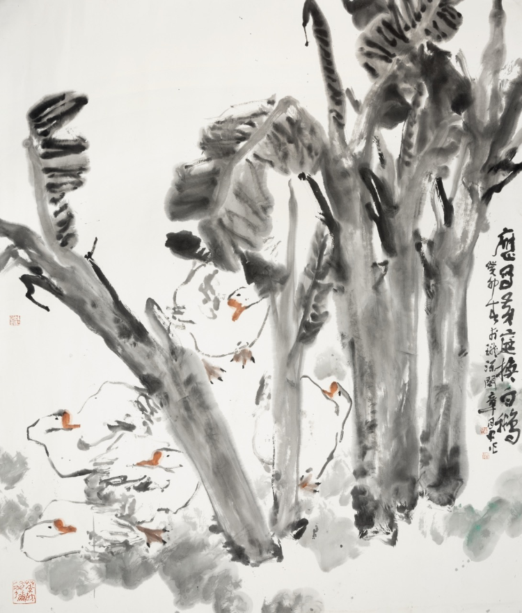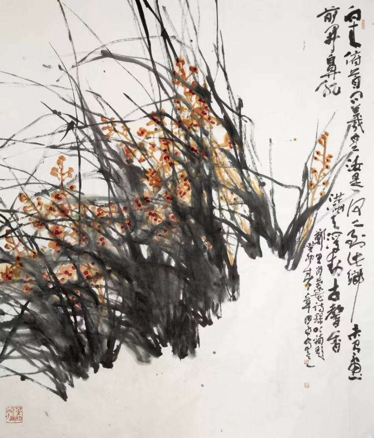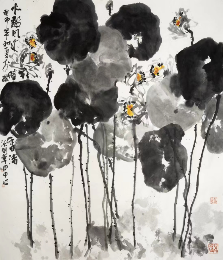 三是水色交融,渾然天成。1702年,石濤在一幅畫上題跋:“一變于水,二運(yùn)于墨,三受于蒙,水不變不醒,墨不運(yùn)不透,醒透不蒙則素,此三勝也?!彼?、墨、蒙說透了水色蒙養(yǎng)的重要性?!冻磷頄|風(fēng)》《紫藤掛云木》《田田翠葉紅蓮香》特別能體現(xiàn)他水色蒙養(yǎng)、用水用色的特點。赤橙黃綠青藍(lán)紫,他持彩練當(dāng)空舞。大膽用水,瀟灑用色,點、烘、敷、抹,蒙養(yǎng)到位,渾然一體。其水氤氳飽滿、浸染朦朧、剔透玲瓏;其色鮮艷明麗、燦爛清新、豐富喜慶。水即是色,色即是水。古人說墨分五色,實際上他的畫不止五色。因為水用得好,色就千變?nèi)f化,創(chuàng)作的作品水色迷人,遠(yuǎn)看近觀水色一天。紅花墨葉成就了大師齊白石。燃燒的《向日葵》、金黃的《麥田》成為西方印象派大師梵·高的代表作。大膽借鑒齊白石、梵·高的用色,在色彩選擇中注入主觀感受,來營造出貼合自己心境的畫面,成為章月中花鳥畫的一大特點:水色淋漓、墨彩交輝。水色帶給觀賞者的愉悅,如春日里看到的鮮花、夏日里吹到的清風(fēng)、秋日里摘到的碩果、冬日里曬到的暖陽,愜意、暢快,心生歡喜。