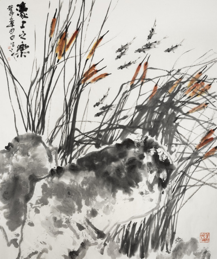 綠水青山就是金山銀山。在祖國大自然的懷抱中,牡丹、梅花、荷花、水仙、向日葵、杜鵑、紫鳶、水仙、柿樹、石榴、葫蘆、蘆葦?shù)鹊然ɑ?、草木、鳥獸,都成為他觀物的對象、考察的客體。特別是前人沒有涉獵的題材,他也下功夫觀察摹寫,搜盡奇花打草稿,為百花寫照,表現(xiàn)其情感,抒發(fā)其情懷。通過對物象、客體的考察和品讀,感受大自然中蘊(yùn)育的生命萬有,生活中的樂觀幸福。他的新作《亂山窮處亦花開》《濠上之樂》體現(xiàn)了他的真實感受、真實筆墨、真實感情、真實自然、真實學(xué)養(yǎng)。唯心在會,唯在妙語。天地有大美而不言。生活美好寓意心中,人文精神躍然紙上。