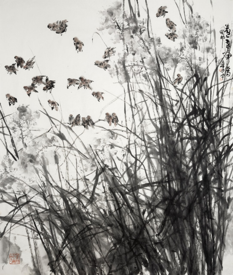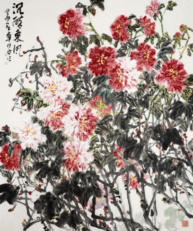 一是全景構(gòu)圖,氣象一新。傳統(tǒng)的花鳥畫總體上說構(gòu)圖比較清逸,折枝的多,賞心只有兩三枝,有時給人情調(diào)荒寒的感覺,如備受推崇的八大山人的作品,雖然經(jīng)常引人沉思、給人感悟,但也經(jīng)常讓人感到孤高冷逸,有與世隔絕的味道,乃至于讓觀賞者沉浸在凄涼悲傷中(如孤鳥白眼單腿)。這樣說,并不是說傳統(tǒng)的構(gòu)圖不好,而是說時代不同了,不能只用傳統(tǒng)的構(gòu)圖形式。時代在變,構(gòu)圖形式也在變。而章月中的花鳥畫,構(gòu)圖形式在吸收傳統(tǒng)的基礎(chǔ)上呈現(xiàn)全景式、團(tuán)塊式。一眼看去上下左右四面八方豐盈飽滿,花花草草成團(tuán)成簇?zé)崃冶挤?。花花草草在他的筆下,茁壯茂盛,生長的頂天立地,朝氣蓬勃。遠(yuǎn)觀賞心悅目,近看墨色淋漓,痛快!其狀、其象、其色氣象萬千。一幅《沉醉東風(fēng)》牡丹圖,大氣磅礴、色彩飽滿、明艷照人,給人以生命怒放的感覺,把觀賞者的精氣神一下子就提了起來,令人心潮澎湃。