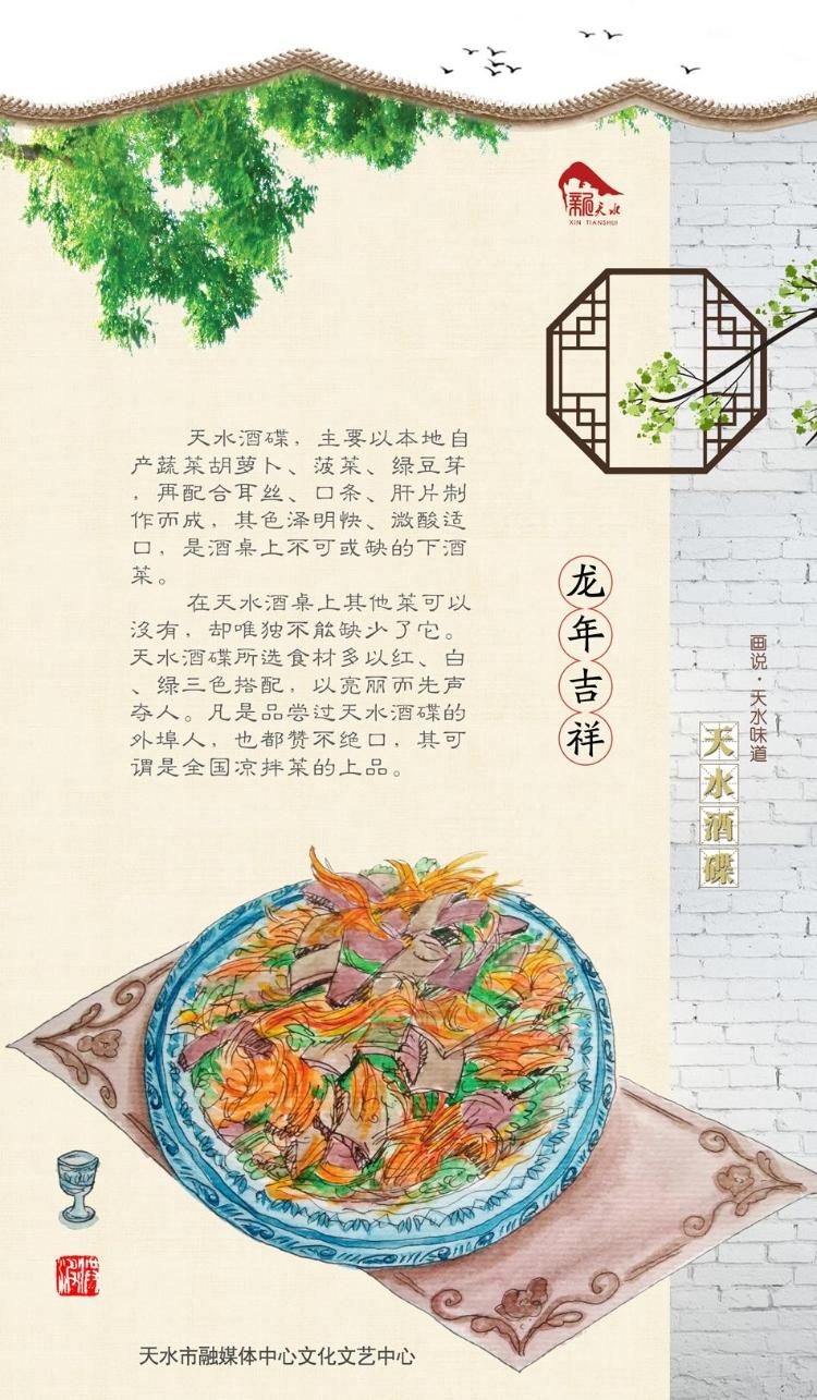 天水酒碟,主要以本地自產(chǎn)蔬菜胡蘿卜、菠菜、綠豆芽,再配合耳絲、口條、肝片制作而成,其色澤明快、微酸適口,是酒桌上不可或缺的下酒菜。
