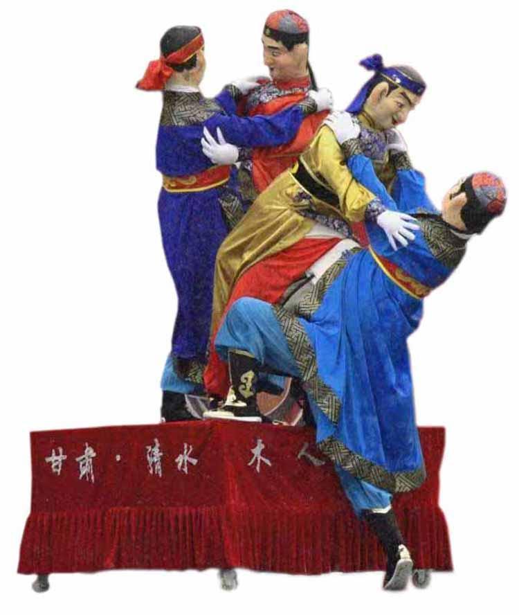 清水木人摔跤的歷史淵源與其他地區(qū)的“二鬼摔跤”“二喜摔跤”極為相似,可以說是古代“抱跤人”的流傳分支,其功能基本相同。逢年過節(jié),清水縣一些民間藝人用桃木雕成兩個(gè)木人頭部裝在固定的木架上,身著古代武士服飾,木人兩手相抱,呈摔跤姿勢(shì),然后套在真人身上。真人兩手裝成一個(gè)木人的兩腳,兩腳裝成另一個(gè)木人的兩腿,表演時(shí)模仿摔跤動(dòng)作,以推、勾、倒、翻等為基本動(dòng)作,按照民間鼓樂曲,或藏或隱,或進(jìn)或退,參差映襯,其鼓點(diǎn)樂曲有“水底魚”“浪頭馬腿”等。