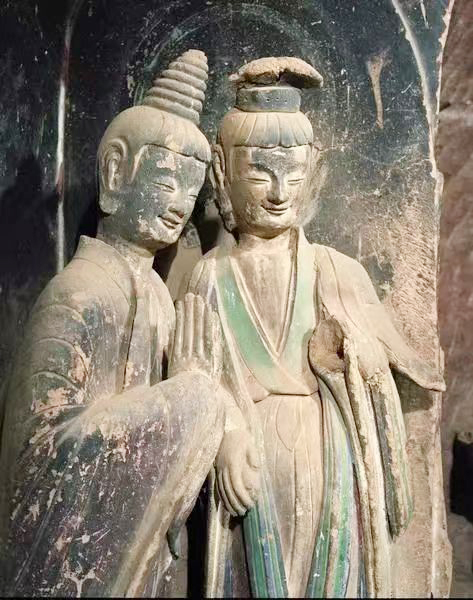 夏朗云:對,石雕還容易風(fēng)化,泥塑在麥積山石窟內(nèi)一般濕度大的環(huán)境里,千百年中風(fēng)化程度似沒有石雕大。我們看到的第44窟坐佛像的這種泥質(zhì)如新,色澤就好像不久以前那樣。但形態(tài)又不是太新,因?yàn)榻?jīng)過千余年風(fēng)霜打磨,顯得特別溫潤。如果太新的話,會感覺火氣比較大,而如今卻是超脫得不食人間煙火的那種感覺。就是說,面貌比較平和鮮活,是歷經(jīng)滄桑又脫穎而出的感覺,新和舊,古和今,形成統(tǒng)一體。所以說,坐佛像既是“生”的,意思是泥質(zhì)如新,他又是“熟”的,意思是說經(jīng)過古代風(fēng)霜的洗禮,面部有些顏料已被打磨掉了,使其露出新鮮“生”的泥質(zhì)。若顏料涂的多反而難看,就好像太濃的妝也不好。此坐佛,在千余年自然的洗禮后,有一種淡妝素抹的感覺,更加感人。其表情是秀骨清像類型中,加入豐腴女性化成分的淡妝素抹者,加之泥質(zhì)的溫潤感,且微微含笑,顯得更加溫婉可親,所以說它是麥積山石窟的一張名片。