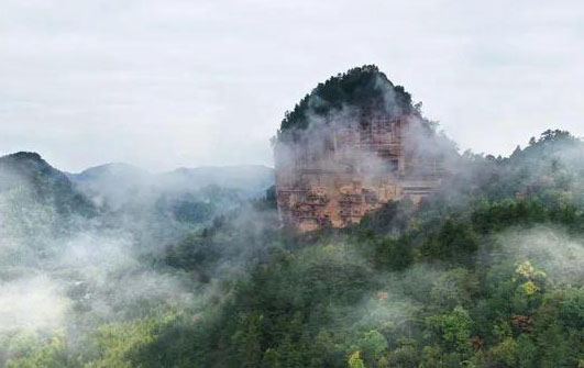 夏朗云:對,因?yàn)橛羞@個自然景觀的資源,也支撐了文化方面的資源豐富,這是一個大的方面。小的方面可談一下丹霞地貌,它是處在秦嶺一片蔥郁的山區(qū)和黃土高原之間的丹霞地貌。紅色的丹霞地貌,是綠色和黃色中間加上了一片紅色,這個地貌就感覺非常的鮮明,是一種賞心悅目的、眼前一亮的這種小地貌。這是一種比較有特點(diǎn)的地貌,在別的地方少見,所以被國家命名為麥積山國家地質(zhì)公園。另外可談一下林區(qū),麥積崖處在林區(qū)的氛圍中,于是產(chǎn)生了“麥積煙雨”這種特殊的景觀。雨季的時(shí)候,基本在夏秋兩季,屢屢見云絲從蔥郁的林木中縷縷地抽出來,然后匯集在麥積山前,變化多端,讓人產(chǎn)生非常豐富的聯(lián)想,形成“秦州八景”之首的景觀,這也是它風(fēng)景上的一個大特點(diǎn)。