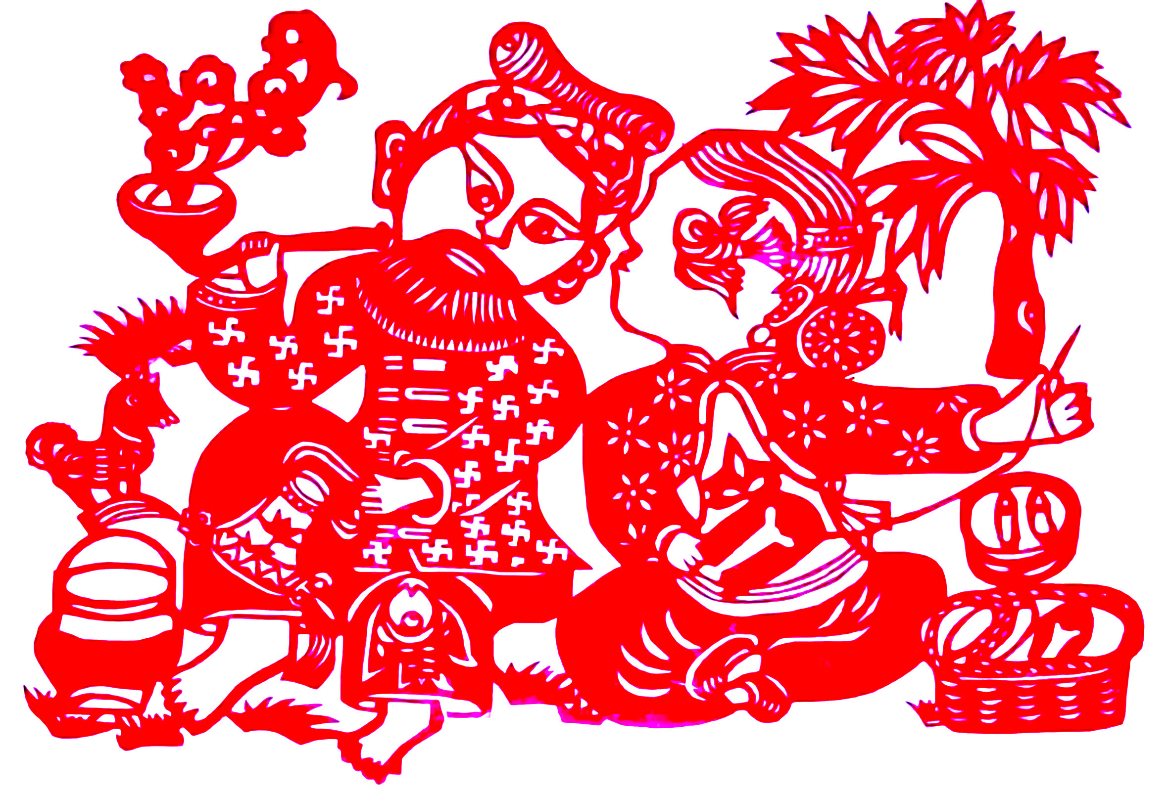 “鏤金作勝傳荊俗,翦彩為人起晉風(fēng)”,唐代詩人李商隱在《人日即事》一詩中這樣描寫剪紙。據(jù)史料記載,在漢、唐時(shí)期,就有使用金銀箔和彩帛剪成花鳥貼在鬢角為飾的風(fēng)尚。隨著時(shí)代的變遷,如今人們在節(jié)日期間會(huì)用彩紙剪成各種花草、動(dòng)物或人物故事等,貼在窗上和墻上。貼在窗上的稱為“窗花”,貼在門上的稱為“門簽”,用于喜事的稱為“喜花”。