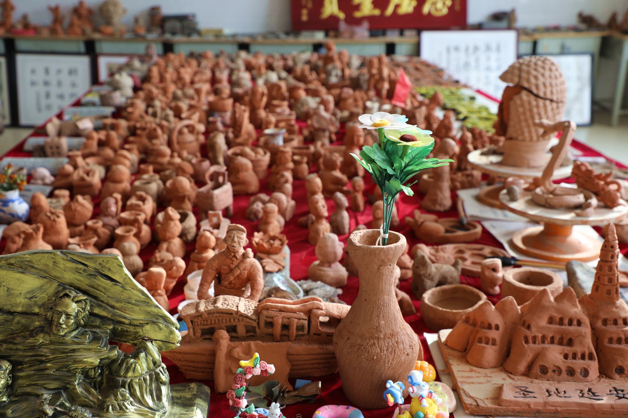 最火的還要數(shù)泥塑工作坊!在這里,普通的泥土能變成紅色故事陶印、民俗文化擺件,累計2000余件學(xué)生作品出爐,800余件優(yōu)秀作品被重點展示。2021年,100枚刻有黨史故事的陶印驚艷亮相;2023年,泥塑刻字拓片作品拿下省級大獎;2024年泥塑工作坊相關(guān)省級課題《鄉(xiāng)村學(xué)校泥塑教學(xué)校本課程開發(fā)和研究》結(jié)題。