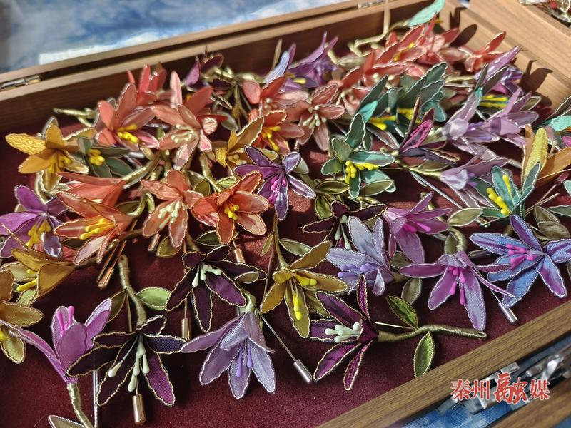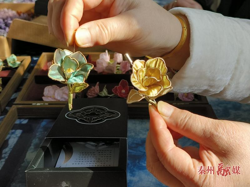 “這個是掐絲的工藝,我們用銅絲掐絲好以后粘在這個面料上,做成花瓣、樹葉,最后組裝成這種玫瑰花。我們女性都是非常愛美的,我們通過觀察大自然的花朵,做出來非常漂亮的花,也展示了我們的非遺手藝?!笔屑壏沁z傳承人于穎說。