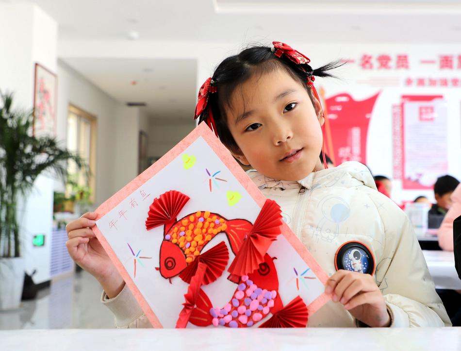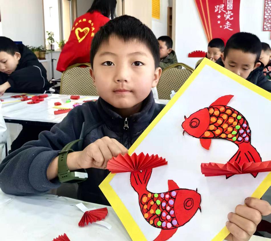 學(xué)生先伊朵自豪地說(shuō):“來(lái)小‘陽(yáng)’課堂很開(kāi)心,學(xué)到新知識(shí)、交到新朋友。你看,這是我做的‘年年有余’作品?!薄霸谶@里能學(xué)知識(shí)、交好友,今天的小魚作品我很滿意。”旁邊的楊悅涵小朋友激動(dòng)地說(shuō)。