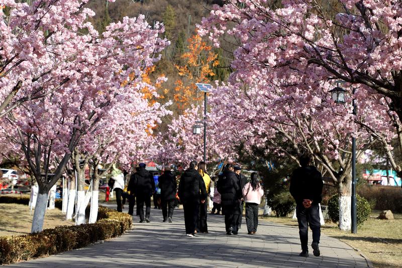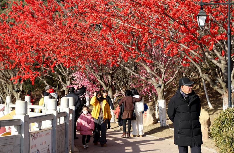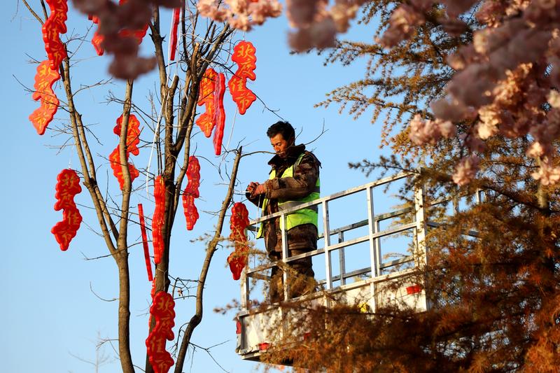 軒轅湖公園內(nèi),冬日的景致因節(jié)慶布置煥發(fā)出別樣生機(jī)。沿湖的樹木上,粉色桃花、艷紅梅花錯落綻放,與金黃的柿子造型、紅彤彤的燈籠交相輝映,一串串燈籠垂掛枝頭,隨風(fēng)輕晃,光影流轉(zhuǎn)間滿是吉祥寓意。