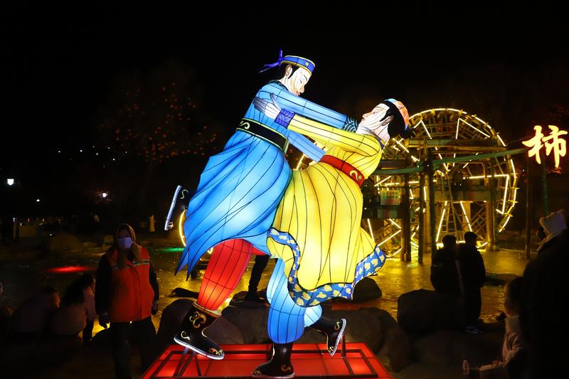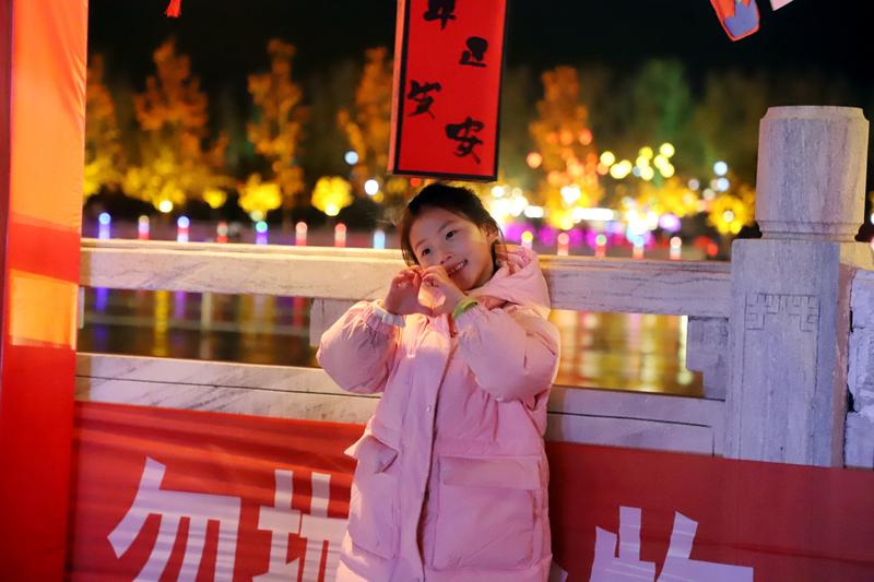 步入公園,連接兩岸的拱橋已是人流如織。數(shù)排暖黃色的宮燈沿橋廊優(yōu)雅懸掛,燈紗上繪著梅蘭竹菊等雅致紋樣,在夜色中暈開柔和光暈,與軒轅湖公園古樸的飛檐翹角相映成趣,恍如步入一幅流動(dòng)的國風(fēng)畫卷。越過小橋,便真正墜入了燈的星河。氣勢磅礴的“將軍策馬”主題燈組昂首欲飛,周身流光溢彩;花燈長廊下,數(shù)百盞由全縣干部群眾親手扎制的宮燈、生肖燈、錦鯉燈織就一條流光通道。目光所及,更有眾多精巧裝置燈點(diǎn)綴其間:莊嚴(yán)典雅的國風(fēng)花臉落地?zé)粞堇[戲曲神韻,靈動(dòng)翩躚的鯉魚飛鶴燈寄托年年有余、松鶴延年的美好寓意,花叢玫瑰燈在步道旁悄然“盛放”,而孔雀漫步、熊貓嬉戲、哪吒敖丙等童趣裝置燈區(qū),則成了孩子們流連忘返的童話樂園。