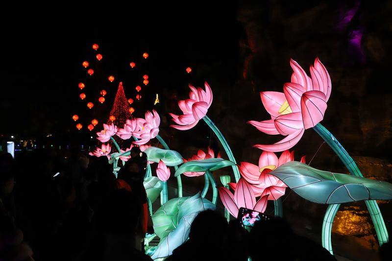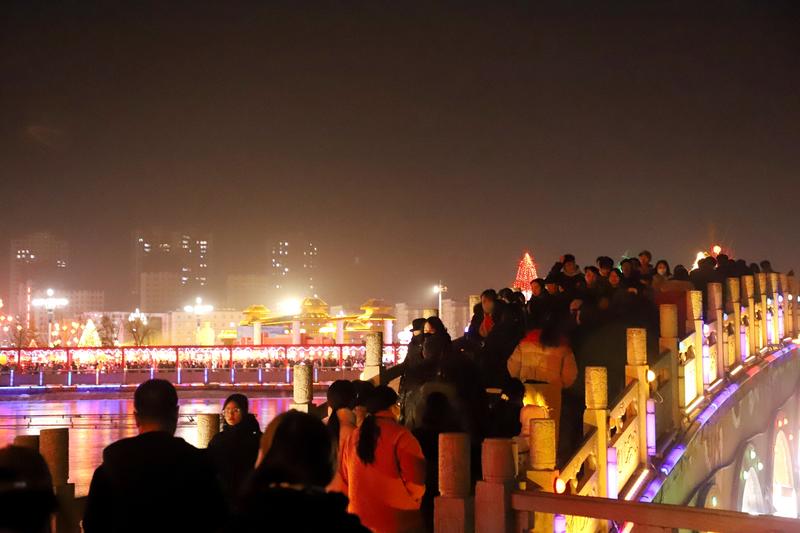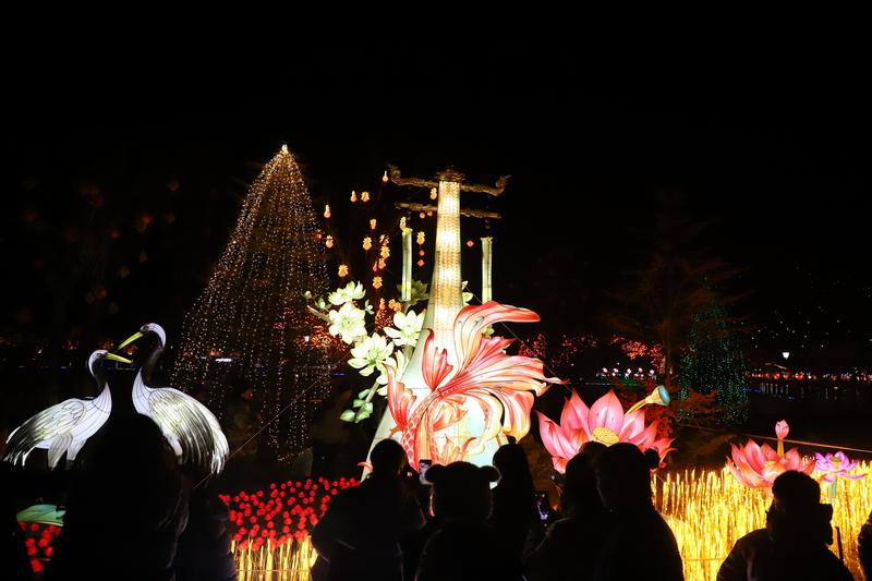 更令人贊嘆的是,園林匠心中深植本土情懷。湖畔樹下,處處裝點(diǎn)著燈籠與仿真花材,簇簇丁香紫、暖柿橙交錯(cuò)點(diǎn)綴,仿若云霞棲落枝頭,不僅呼應(yīng)了清水“丁香名縣”的生態(tài)品牌,更巧妙延續(xù)了此前“柿柿如意”鄉(xiāng)村文旅活動(dòng)的溫暖意象。盡管時(shí)值寒冬,軒轅湖公園卻因這滿園燈影與“花”意,煥發(fā)出盎然春趣,實(shí)現(xiàn)了“人在燈中走,如在畫中游”的沉浸詩意。