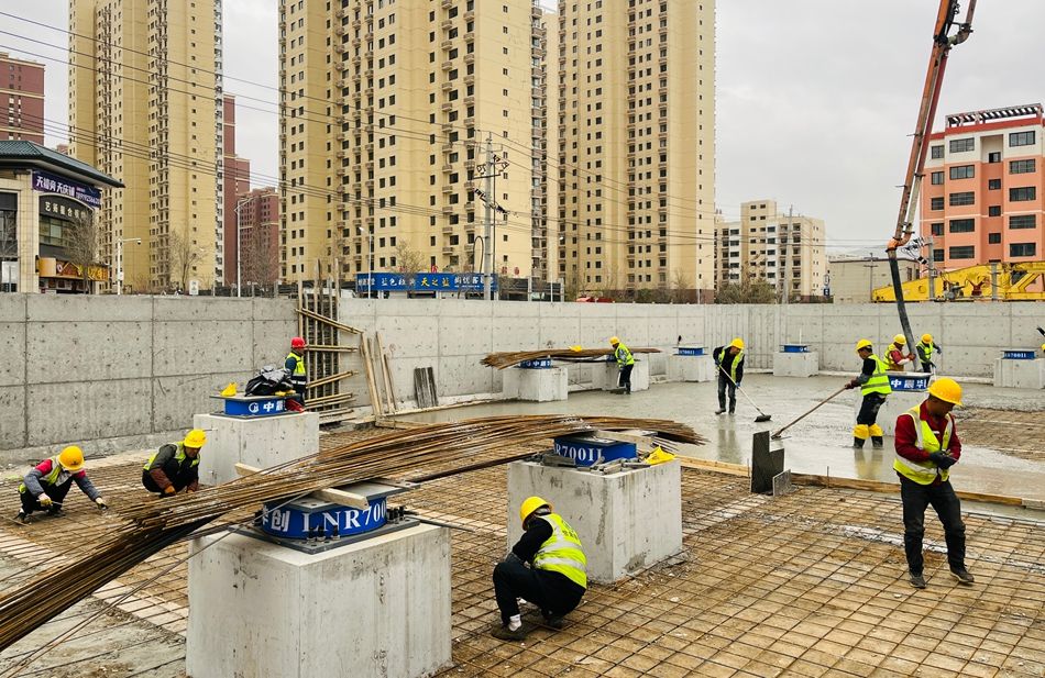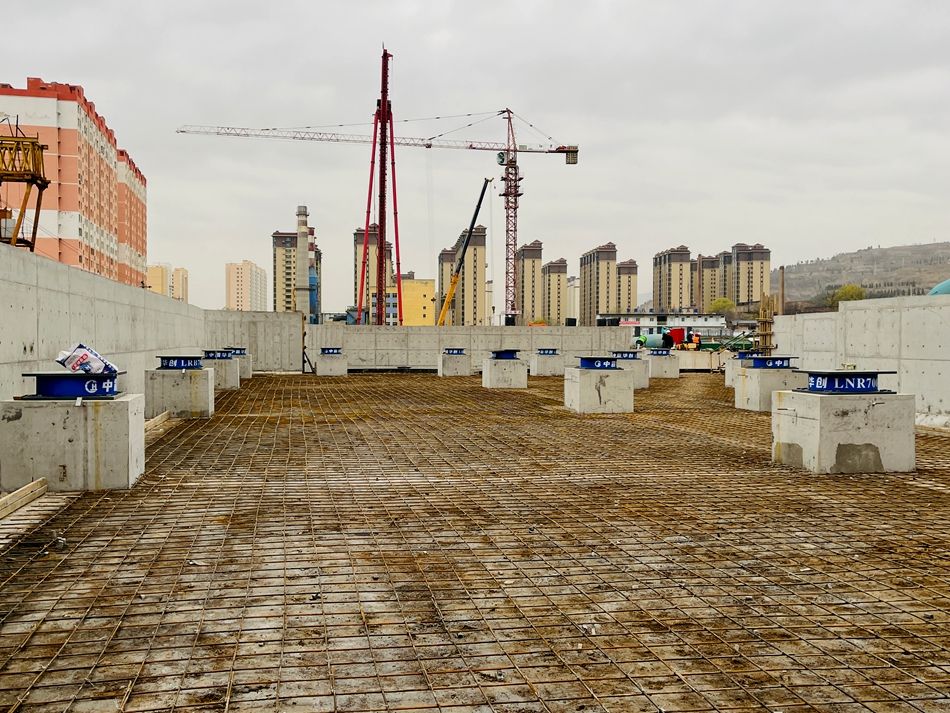 “我們負責的是天禧學校高中部項目,建筑面積15656平方米。自開工以來,已完成兩個單體工程教學樓A段、B段的地下樁基礎、承臺、地梁基礎、隔震支座基礎施工。目前已進入隔震層施工階段,施工現(xiàn)場正在進行隔震支座安裝及一節(jié)柱預埋鋼柱安裝,整體施工進度正穩(wěn)步推進。”甘肅省第八建設集團有限責任公司項目總工張巖峰介紹道。